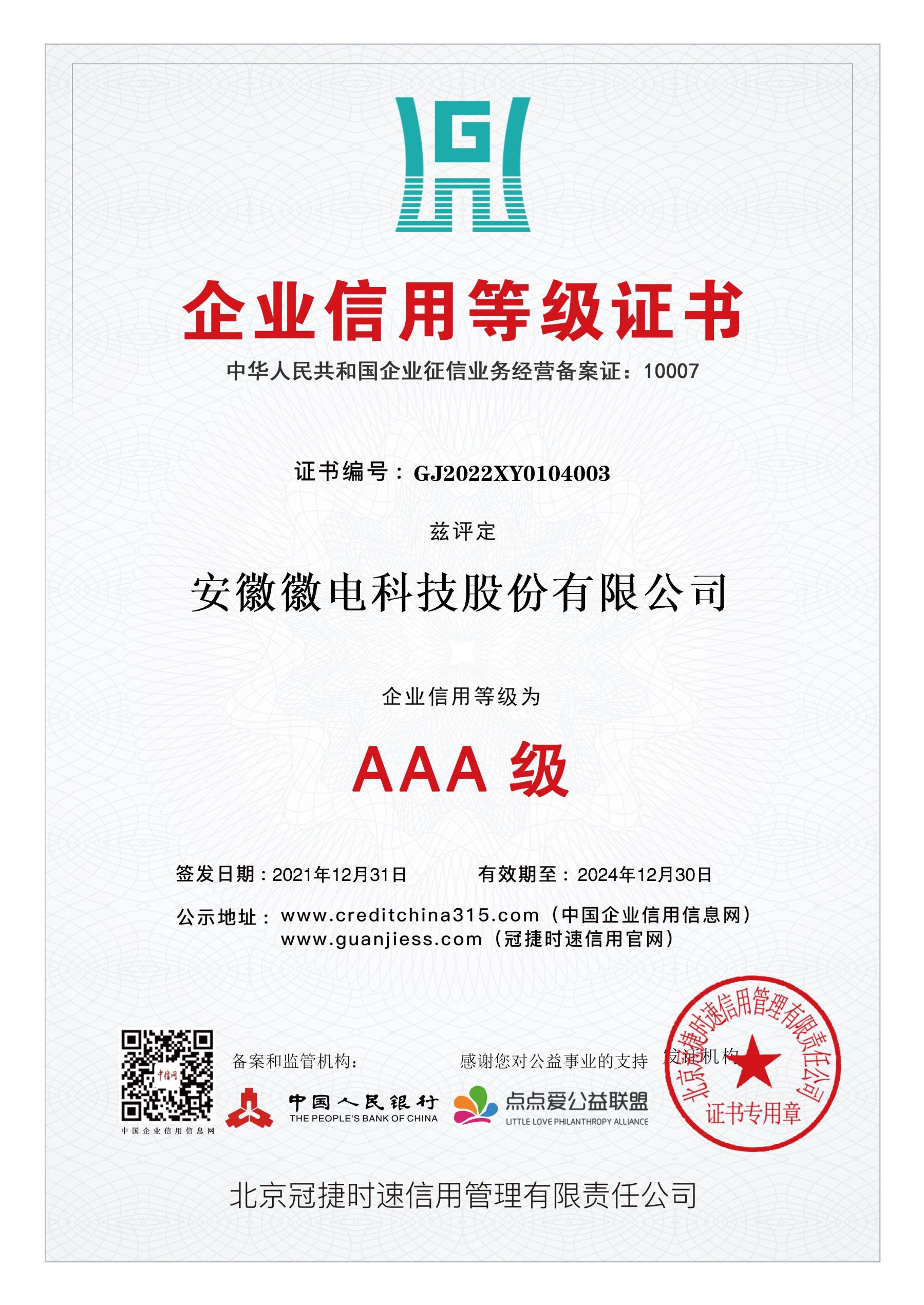“AAA級企業信用等級”是企業信用評定的最高級別,標志著徽電在規范運營、誠信經營層面得到國家相關部門及權威機構的高度認可。