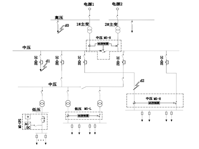 在總降進線和母聯采用MS無擾動雙電源快速切換裝置,當某一電源發生故障時如d0點,MS進線打開,母聯開關合閘,用另一路電源帶兩段母線,保障供電的連續性,整個切換過程可控制在20ms。
